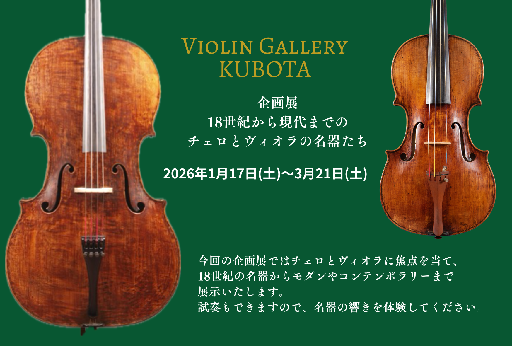 1月17日より「企画展 18世紀から現代までのチェロとヴィオラの名器たち」を開催いたします。今回の企画展ではチェロとヴィオラに焦点を当て、18世紀の名器からモダンやコンテンポラリーまで展示いたします。試奏もできますので、名器の響きを体験してください。